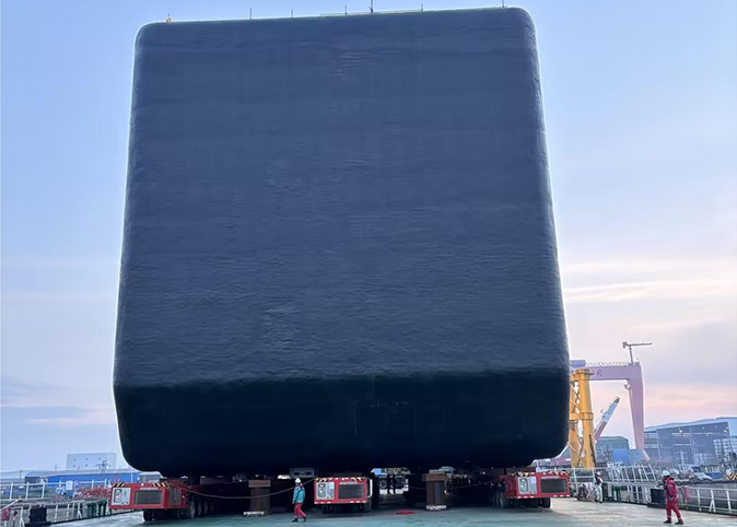 A型LPG液货舱长22米,宽45米,高31米,是专用于装载液化石油气的装置,单台LPG储舱结构重量约1600吨,总容积约23220m³,将这个“庞然大物”滚装上船,对运输各环节要求十分严苛。