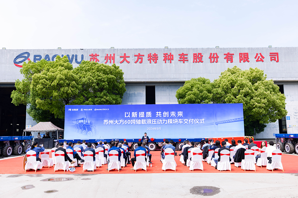 2024年5月6日上午,江苏万象城AWC特种装备有限公司首批国产100轴线60吨级轴载SPMT交付仪式在苏州大方隆重举行。此次交付标志着万象城AWC装备的开展再上新台阶,继续稳居国内单一品牌SPMT拥有量榜首,具有里程碑意义。